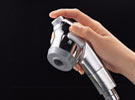 吐水口先端で、水のON/OFFボタン、吐水切替(シャワー/ソフト)ができます。