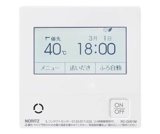 オートタイプの基本機能湯はり、追いだき、保温までを自動で行います。![]() 無線LAN対応リモコンとの組み合わせで遠隔操作も可能無線LAN対応のリモコン(RC-G001EW)を組み合わせることにより、スマートフォンで給湯器を操作できるようになります。外出先からもお風呂を入れる事ができるようになり、便利です。![]() 快適&便利機能●追いだきスイッチを押すと、今の浴槽の湯温+1℃になります。設定温度に達していなかった場合には、設定温度まで沸かします。 ●マイルド追いだき 今までは、設定温度までMAXに温めていたため熱く感じていましたが、マイルド追いだきは、設定温度付近になると熱く感じないように徐々に温めます。 ●フレックス保温 浴槽の湯温低下に応じて「自動追いだき」を行い、保温間隔を20分・45分・60分と可変させ、効率的な保温と省エネルギーを図ります。 ●沸上予約 おふろの沸き上がり時刻を予約できます。セットした時間におふろ沸かしが終了します。 |