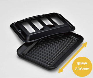 上部のスリットから直火が届きこんがりと焼き上げ、ムラなく熱が伝わるアルミ素材で包み焼きのように食材の旨味を逃しません。プレートの底は波型形状で油切れもいいので、ヘルシーなノンフライ料理にも活躍します。
