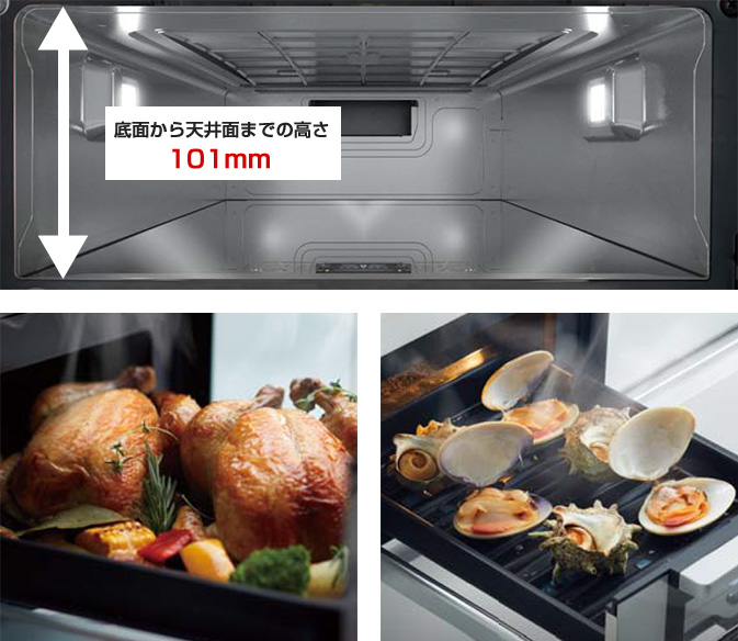グリルの有効庫内高さが101mmあるため、高さのある食材※も調理可能です。