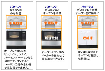 コンロの下にオーブンが入っていて、上のコンロを取り換える場合は、概ね次の3つのパターンをとることになります。