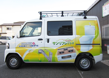 ボディ全体にトイレやガスコンロ、蛇口といった住宅設備機器が描かれています。