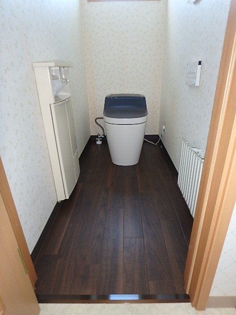 便器を取り外し、クッションフロアの施工から開始いたします。