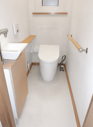 手すりは以前からお使いのものを再利用し、タンクレストイレへの交換と手洗いカウンターを設置。手洗いカウンターが、手すりと同じようなナチュラルブラウンのため、統一感があります。