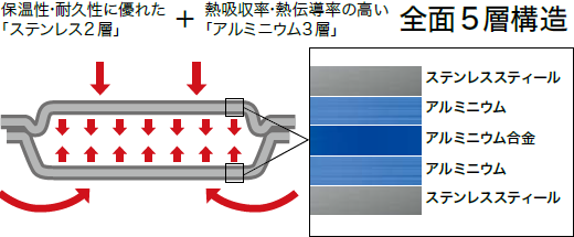 保温性に優れたステンレス2層と、熱伝導率の高いアルミニウム3層、計5層の構造を本体・フタに使用しているため、密閉性が高く、熱が逃げにくくなっています。