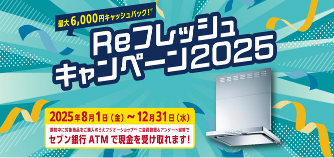 対象のレンジフードをご購入・設置いただいた方に、もれなく現金キャッシュバックのお得なキャンペーンです!こちらはリンナイ〈我が家のアップデートキャンペーン〉と併用可能です!