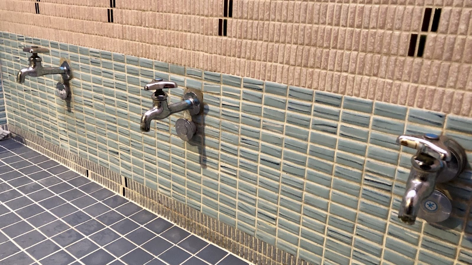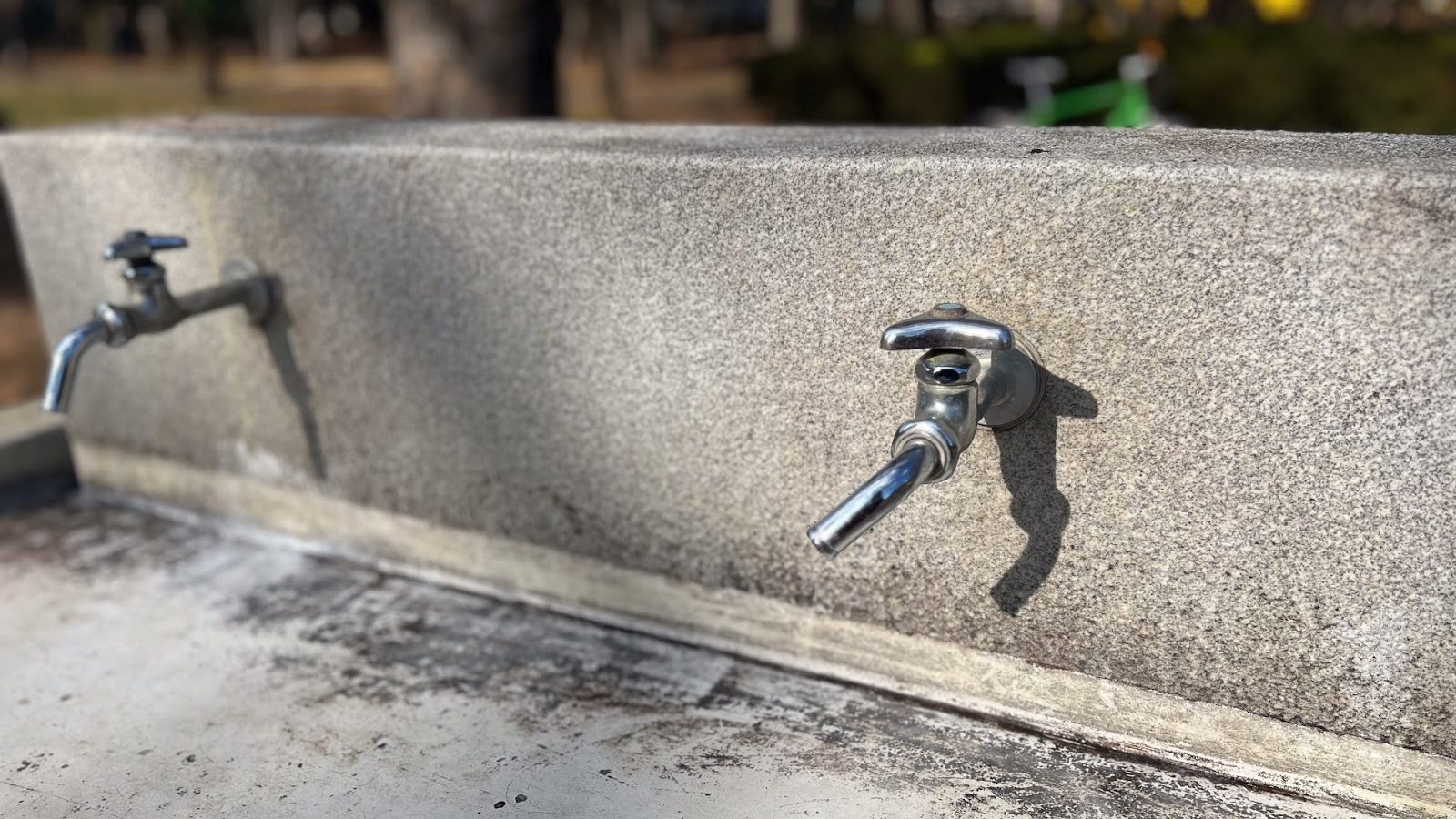壁から横方向に出た単水栓。吐水口は固定です。水の勢いが強く、屋外に設置されていることが多い蛇口です。