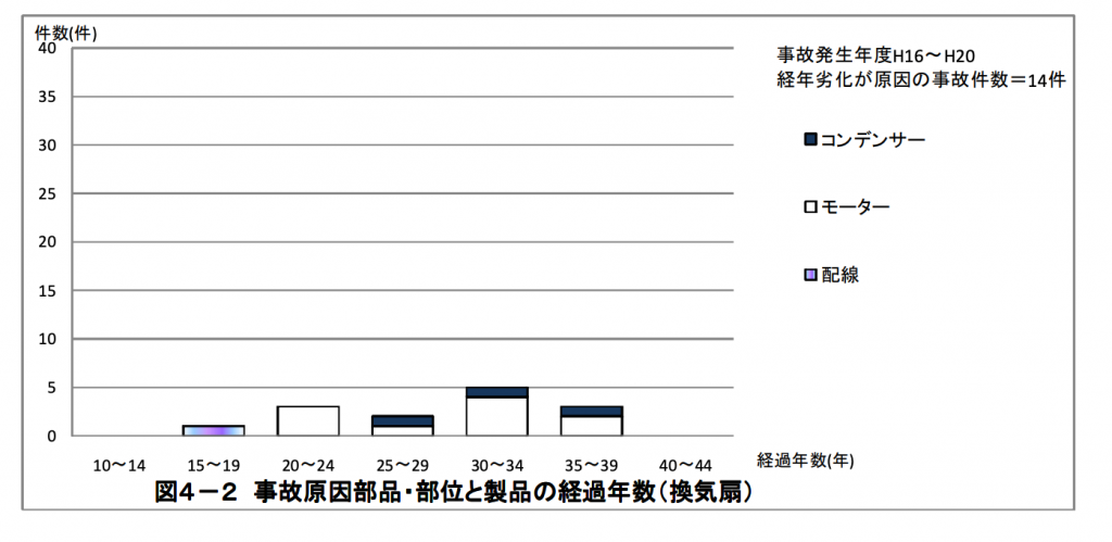 製品安全センターの調査でも、15年を超えたあたりから換気扇の事故が増え、特にモーターの劣化が原因の火災が複数確認されています。