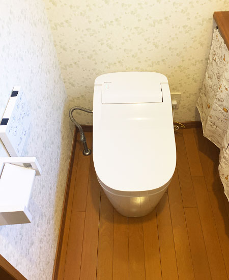 「掃除しても汚れが落ちずウォシュレットが老朽化で水もれしたため交換しました。 ホームページは1階以上のトイレの設置に関して水圧を気にしていたが2階用のトイレ選択できるためわかりやすいかった。ゆがんでしまう可能性のある床材の柄などわかりやすかった。 工事当日は指定された工事時間より早く終了し床・壁紙の仕上がりがきれいでした。トイレホルダーの位置を変えた方が使用しやすいなど工事中に提案していただき位置を変更しました。今まで何回もトイレホルダーにあたり破損となったことがあり変更していただいたため今はぶつからずに使用しやすくなりました。以前トイレホルダーがついていたところもわからない仕上がりで満足です。 以前のトイレより節水ができているようですがしっかりと流れます。また流れる音が静かになりました。