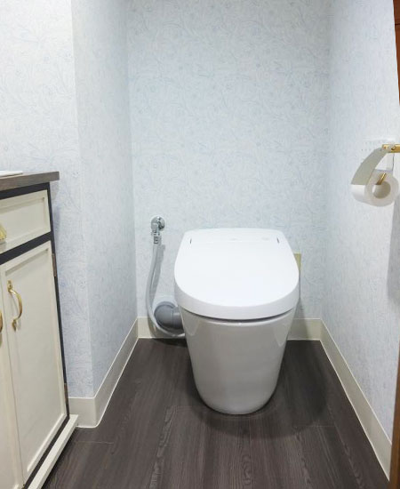 「ウォシュレットの止水栓から水漏れがし始め、これを機に思い切ってタンクレスにリフォームしようと思いました。 HPでは知りたい情報が探し易く、特にランキングは参考になりました。また、施工事例の写真を参考にさせてもらい、大変役に立ちました。 丁度値上げ前の繁忙期でしたが、それ程待つ事なく見積もりを提示してもらえました。また、納期遅延の途中報告連絡も月に一回はもらえ、安心して待つ事が出来ました。商品が入荷した旨連絡頂いた後のやり取りは、迅速に対応してもらえ、安心してお任せ出来ました。 我が家の配管の形状が、購入したタンクレスを取り付ける際に少し手前に出ると説明を受けましたが、全く違和感なく、とても丁寧に仕上げて下さいました。選んだ壁紙も想像以上にキレイに仕上がり、思い描いた通りとても素敵にリフォームでき大満足です。 TOTOのネオレストが気に入り、納期遅延を承知で入荷待ちしておりました。その間に家のトイレの水漏れが酷くなってきて対策に苦労しましたが、リフォーム後のトイレが思った以上に素敵に仕上がり、使い心地も大満足です。 もう何度も御社を利用させて頂いてますので、今回も安心してお任せ出来ました。工事前の説明もしっかりしてもらえて、納得した上で施工してもらえました。」